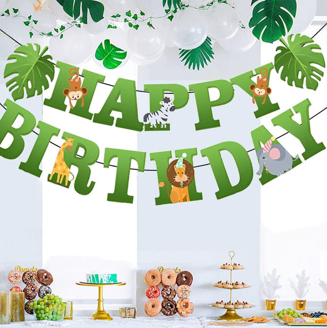 Този банер с тема „Честит рожден ден“ с тема „Зелена джунгла“ внася нотка магия и приключение във вашето парти. Ярките цветове и графики на листа и диви животни създават весела и завладяваща обстановка за всички възрасти.