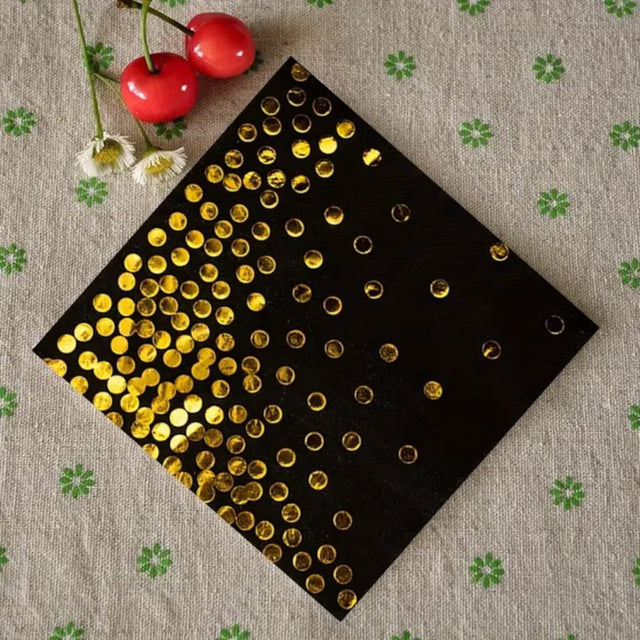 Комплектът от 20 хартиени салфетки, 17 x 17 см, със златни точки, добавя елегантен и празничен щрих към вашите маси, идеални за партита, годишнини и специални събития.