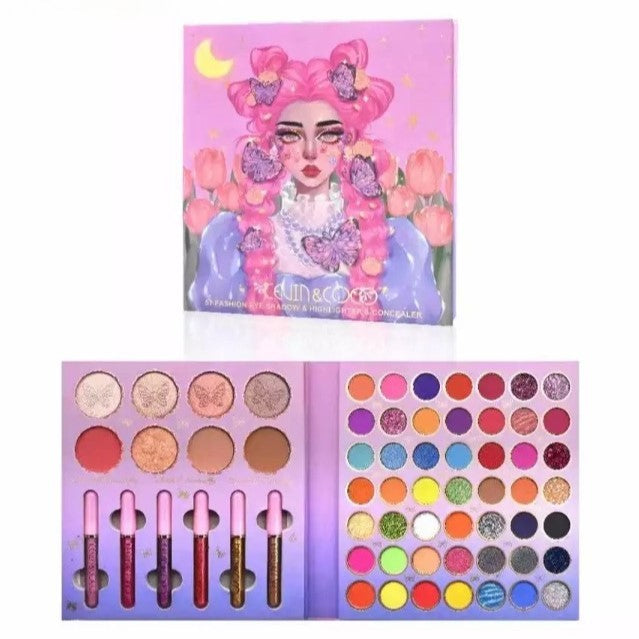 Комплект грим, палитра Kevin&Coco с 53 сенки за очи, хайлайтър, коректор и червила,