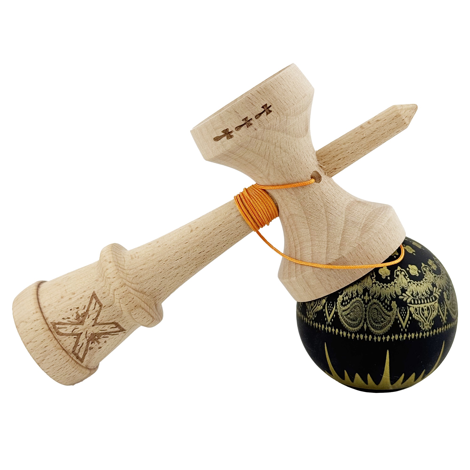 Kendama X Originala, Profesionala, Flippy, Legendary IMPERIAL, Super Sticky, Cupe Mari KING SIZE V3, Gaura in Baza, Rulment Metalic, din lemn 18 cm, Ata 62/65 cm, Negru/Auriu