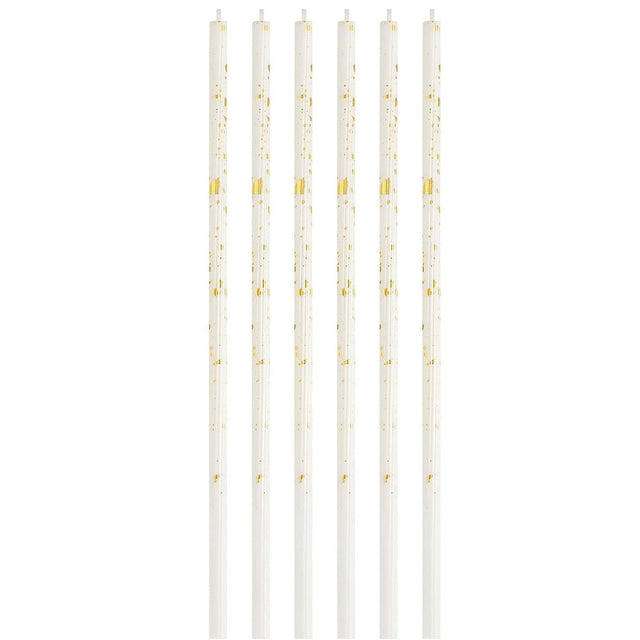 Комплект от 6 дълги свещи, парафин, честит рожден ден, бели/ - Златен / 10 х 0,5 см Задържано е и ще бъде изпратено веднага щом е отново налично.