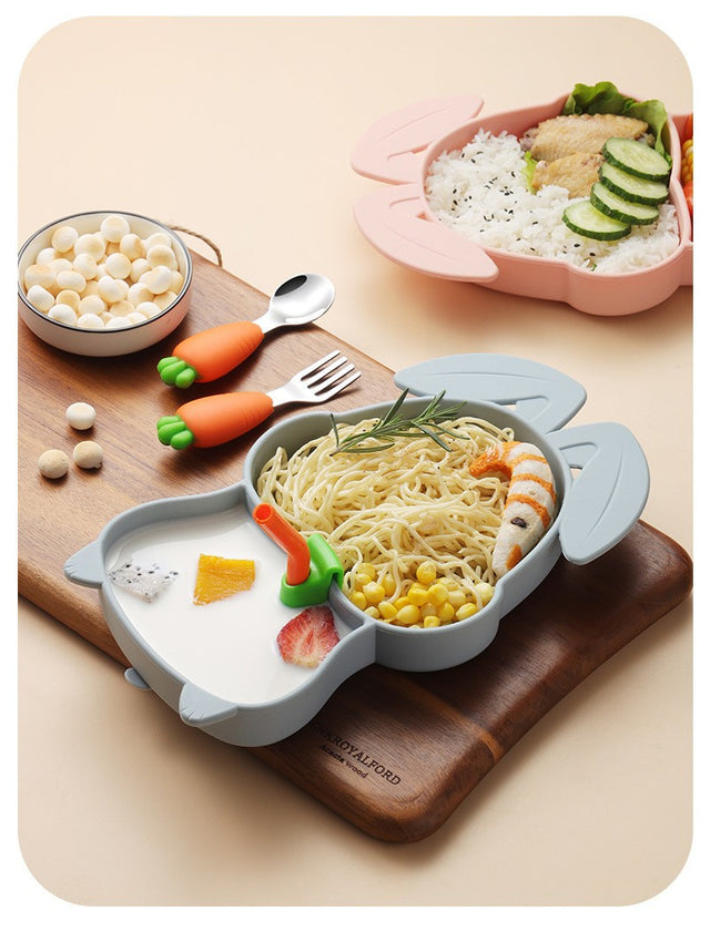Set de masă pentru bebeluși din silicon sigur și fără alergeni, cu farfurie compartimentată în formă de iepure, tacâmuri ergonomice, ventuză de fixare și accesorii utile (pai și perie).